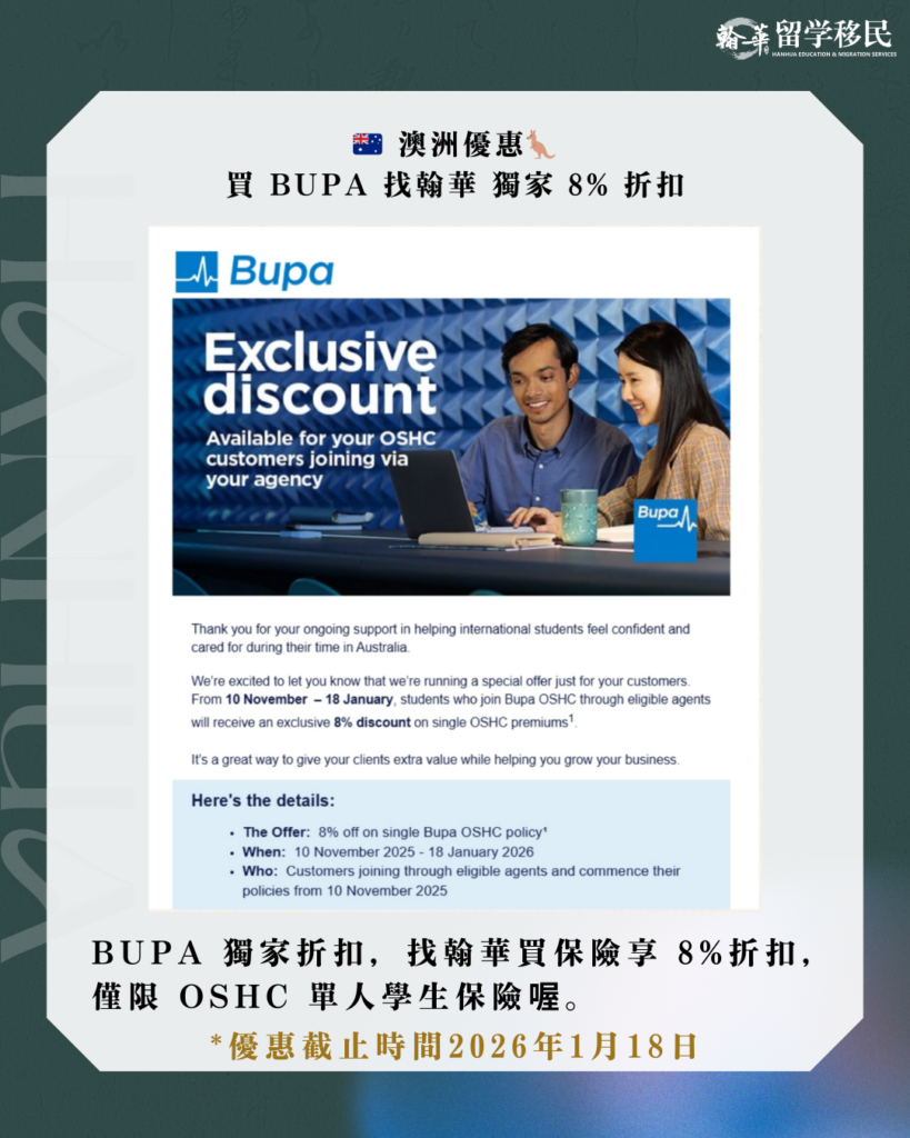 獨家優惠 買 BUPA 找翰華 獨家 8% 折扣 2026 年 1 月 13 日 翰華小熊 買BUPA 學生保險 OSHC 享有獨家8% 折扣優惠! 優惠期限至2026年1月18日 請聯繫我們索取福利! #澳洲留學 #bupa #學生保險 #OSHC #翰華留學移民