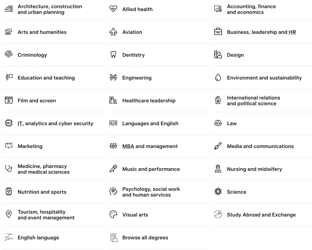 格里菲斯大學提供超過 300 門學位課程,以下是學校強勢與特色領域: