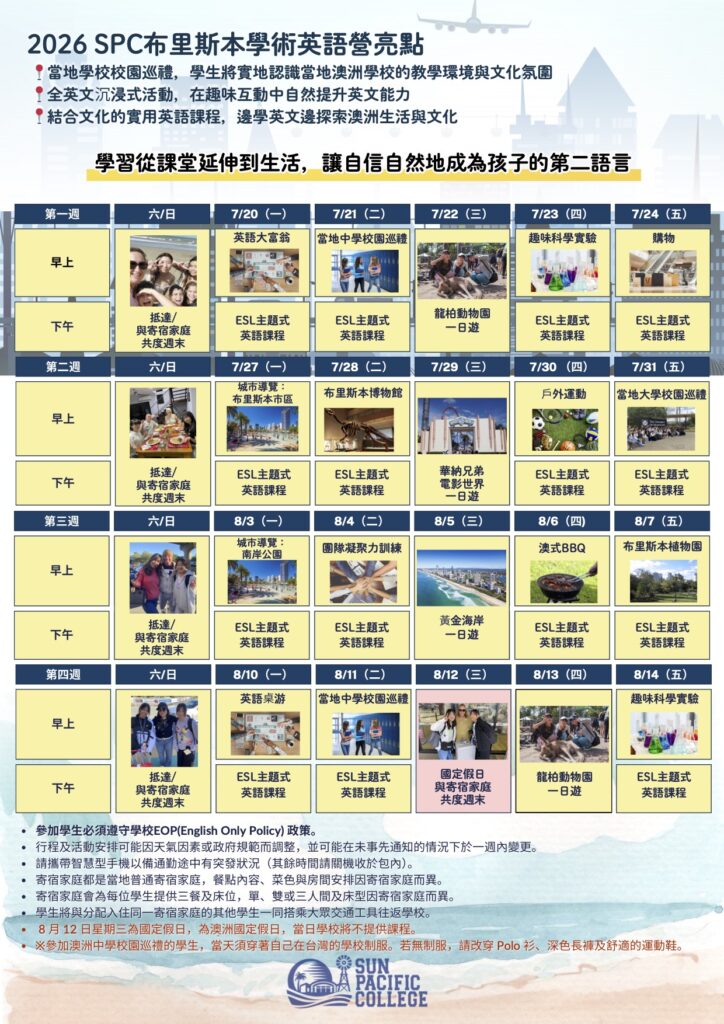 - 參加週數: 1 到3 週 (每週一開始,營隊期間任選3週,彈性報名)