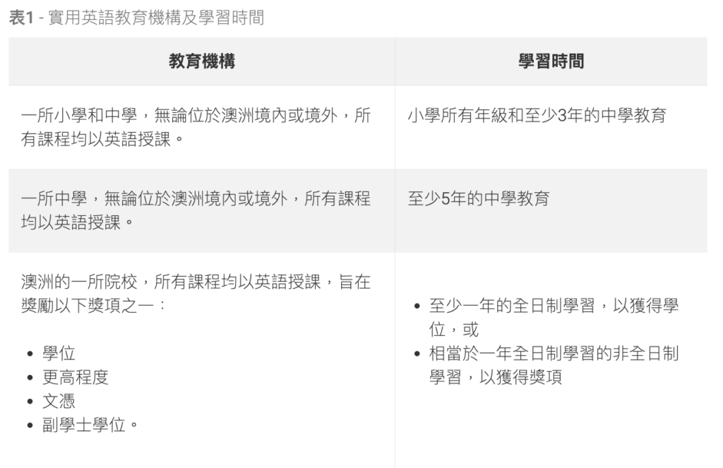 在申請簽證之前的 3 年內,您已達到表 1 的一項考試成績