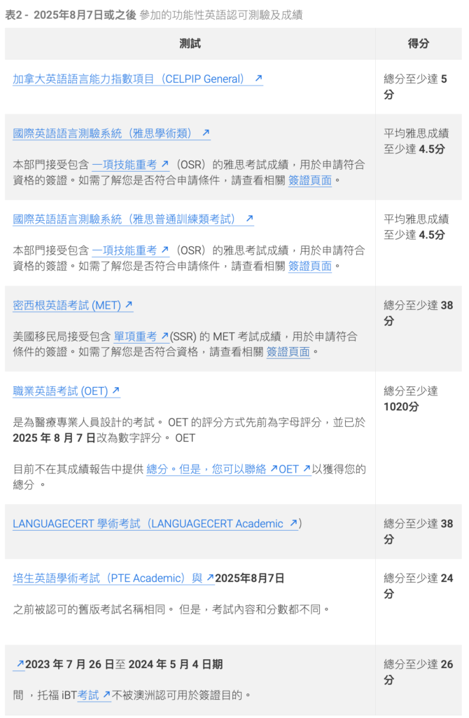 澳洲簽證認可的英語語言考試內容有所變更。如果您在此日期之前參加了考試,您的成績可能仍可作為英語能力證明,有效期最長可達3年,具體取決於簽證類別。