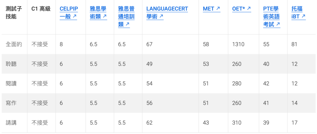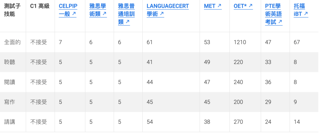 - OET目前不在考試成績報告中提供總分。請聯絡OET以取得您的總分,並在申請時提供所需資訊。
