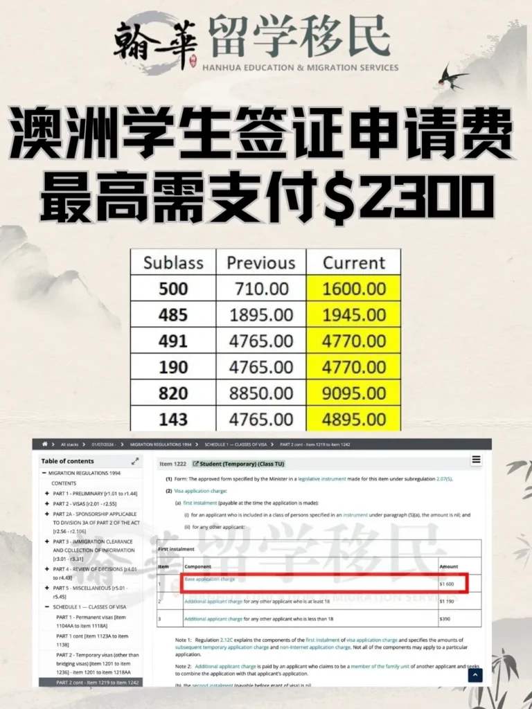 🔹 学生签证(Subclass 500)申请费:从$710澳元暴涨至$1600澳元,涨幅超过一倍!对境内2次续签申请人额外收取 $700 附加费用,总计 $2300 澳元!