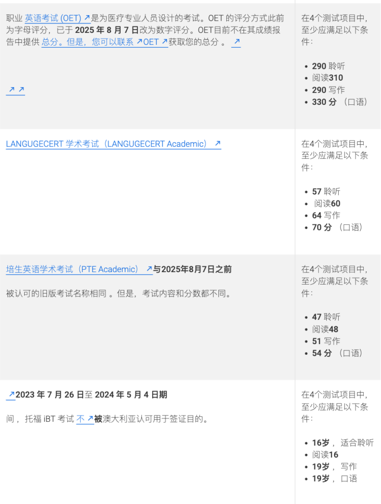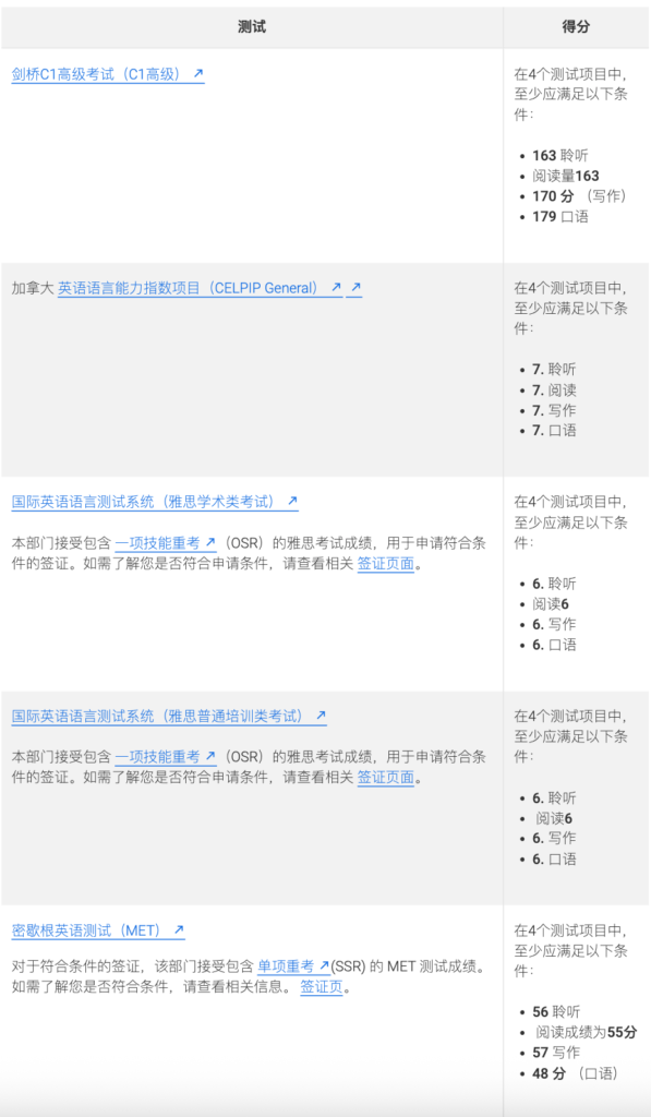 在申请签证之前的3 年内,您已达到表1 的一项考试成绩